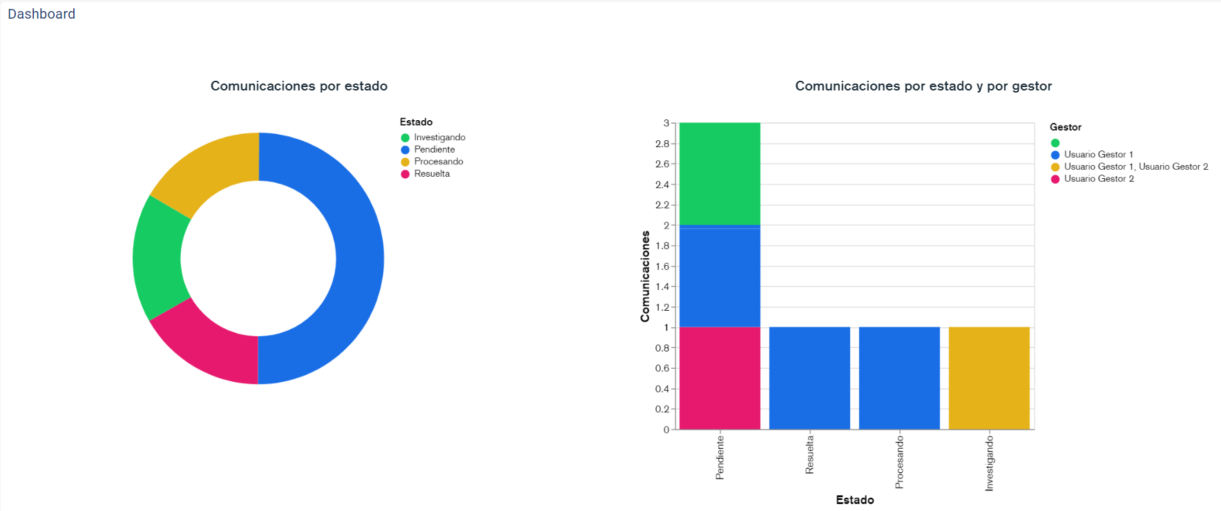 - Comunicaciones por estado y gestor: Gráfica de barras para identificar cuántas comunicaciones están asignadas a cada gestor, y en qué estado se encuentran.