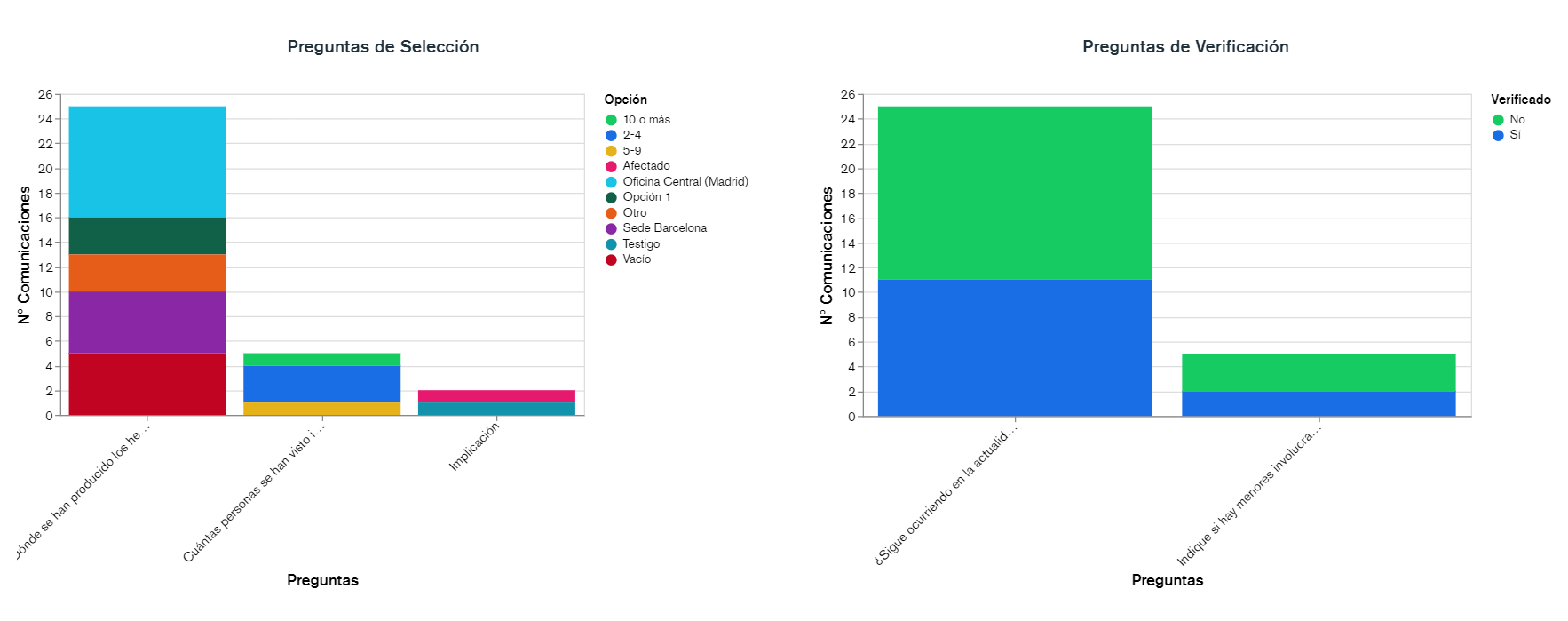 - Preguntas de selección: Gráfica de barras para consultar, de las preguntas de tipo desplegable, cuántas comunicaciones tienen cada opción seleccionada.