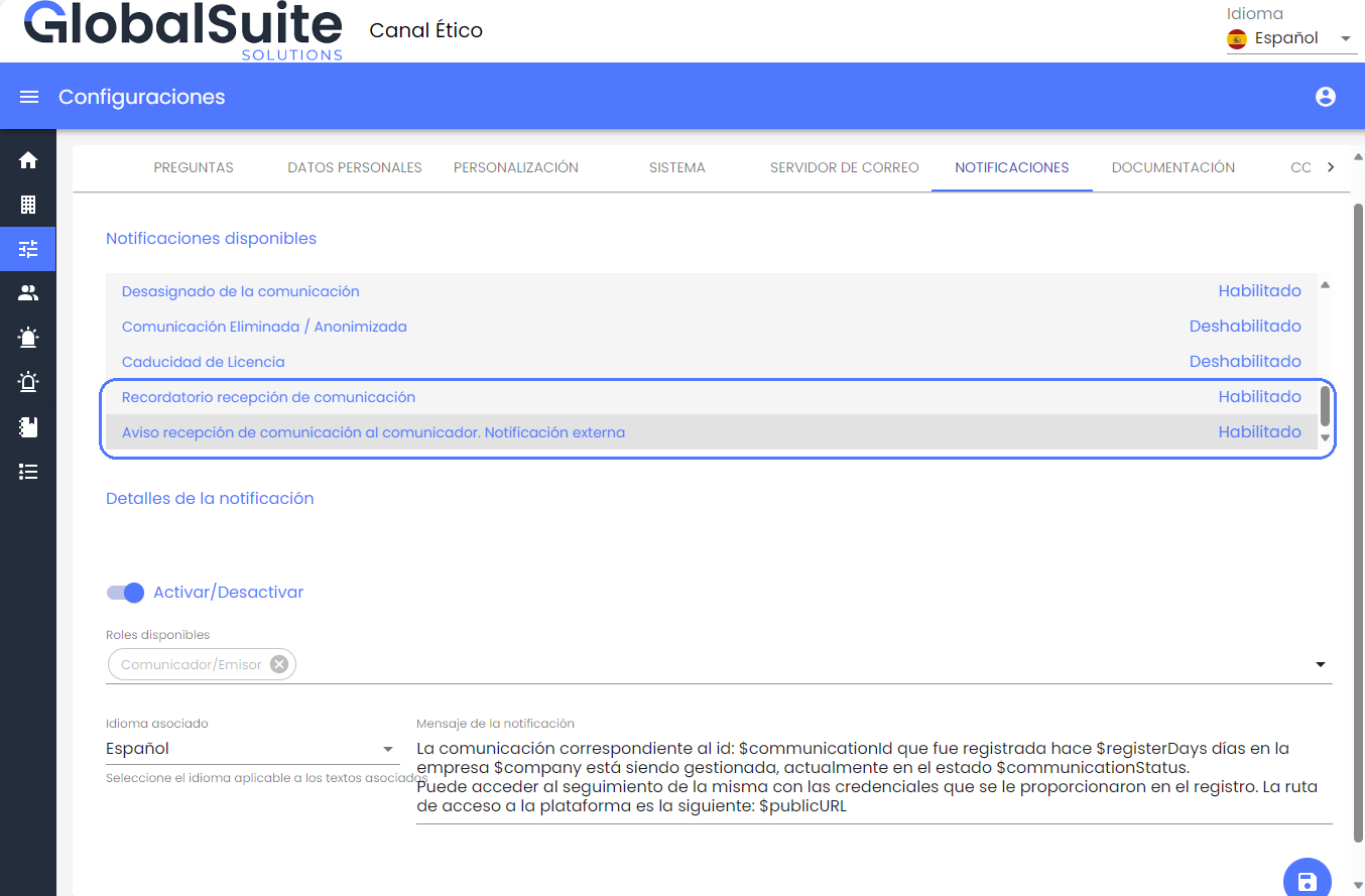 Aviso recepción de comunicación al comunicador. Notificación externa: Permite notificar del estado o situación de la denuncia registrada en el Canal, cuando pase un determinado número de días desde la creación. Esta alerta por correo electrónico se enviará únicamente en caso de que el comunicador no la haya registrado de forma anónima.