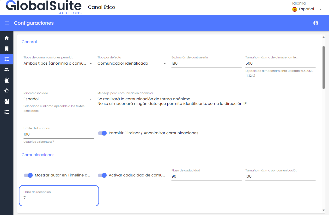 El número de días a desde la recepción a los que se enviará la alerta es configurable en Configuraciones > Sistema, estando establecido por defecto en 7 días desde la recepción de la denuncia.