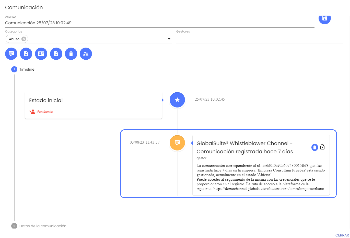 Además, en el caso del aviso de recepción al comunicador, dejará registro en el Timeline de la denuncia de esa comunicación realizada