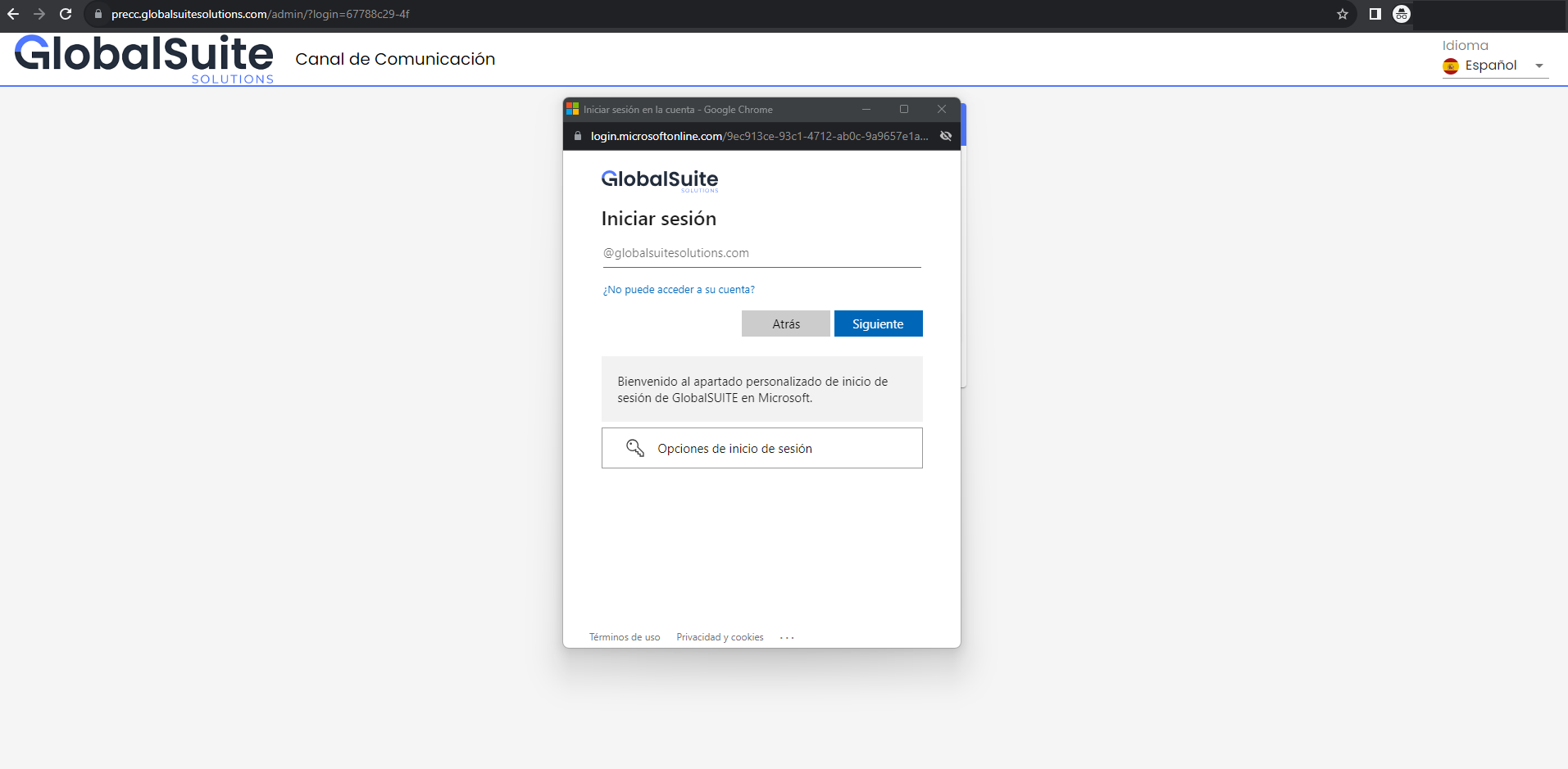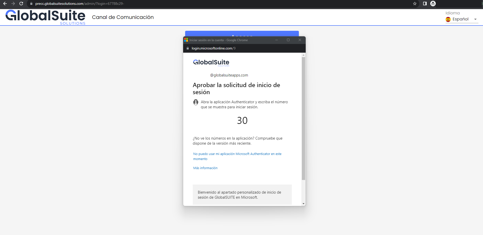 En caso de tener configurado el uso de MFA (Multi Factor Autentication) en Azure AD se solicitará el código de verificación a través de Microsoft Authenticator, correo electrónico o SMS. Esto es compatible con el mecanismo de 2FA que está incluido en GlobalSuite® Whistleblower Channel y que se podrá habilitar.