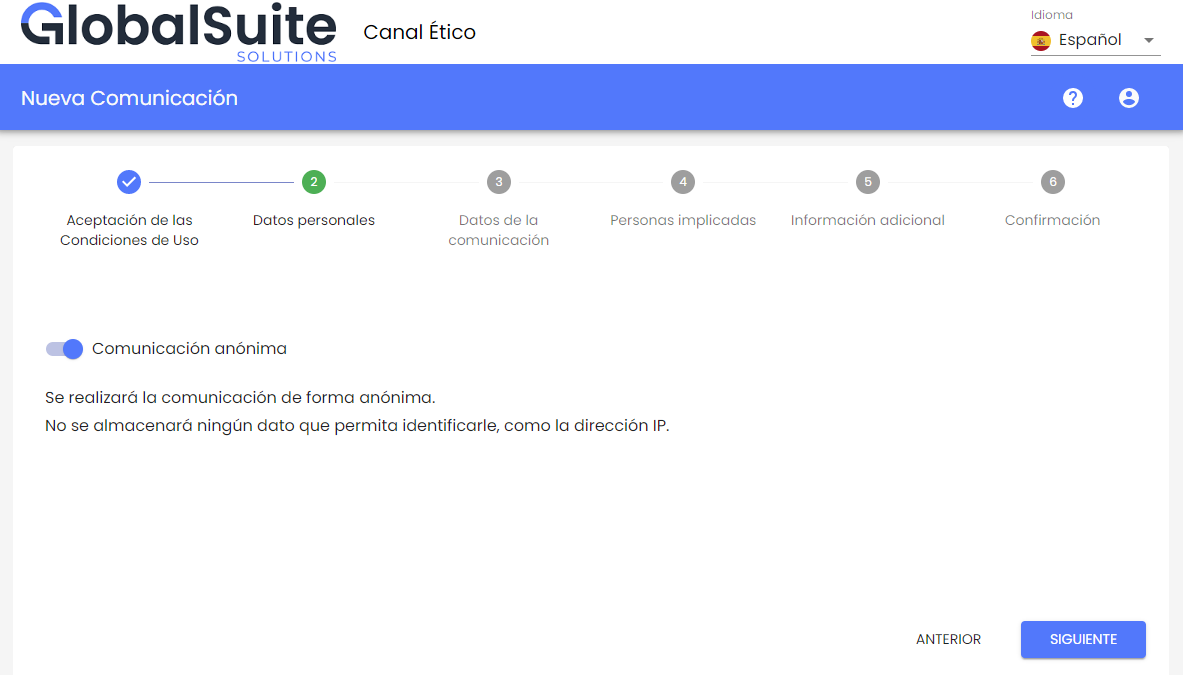 - Este mensaje le aparecerá al denunciante en el formulario de una nueva comunicación, en el apartado donde se indica si la comunicación se realizará de forma anónima o identificándose.