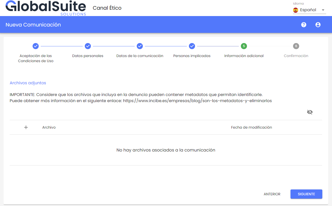 - Puede personalizar un mensaje, en todos los idiomas disponibles en el Canal, que aparecerá en la tabla de Adjuntos del formulario de la denuncia, además de al aportar un nuevo archivo una vez enviada la denuncia.