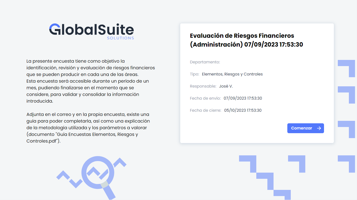 En esta versión, se ha incorporado en el módulo de encuestas de GlobalSuite® una nueva funcionalidad que permite programar la creación y lanzamiento de encuestas de Elementos, Riesgos y Controles de forma periódica. Como principales características: