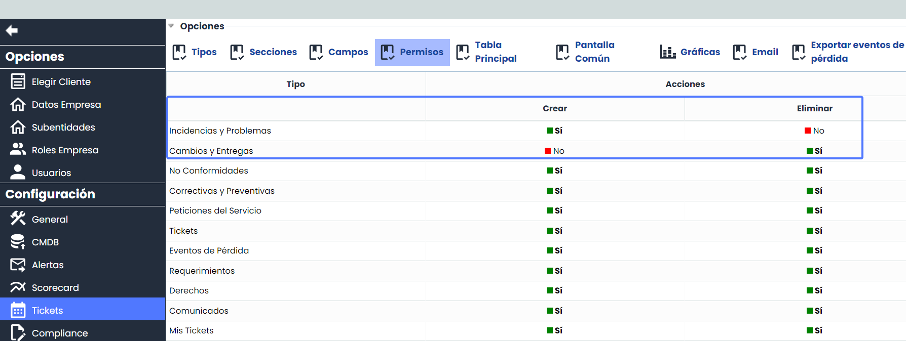 - Estos permisos también tendrán efecto en la creación de los tickets en las tablas de entrada y salida de la herramienta.